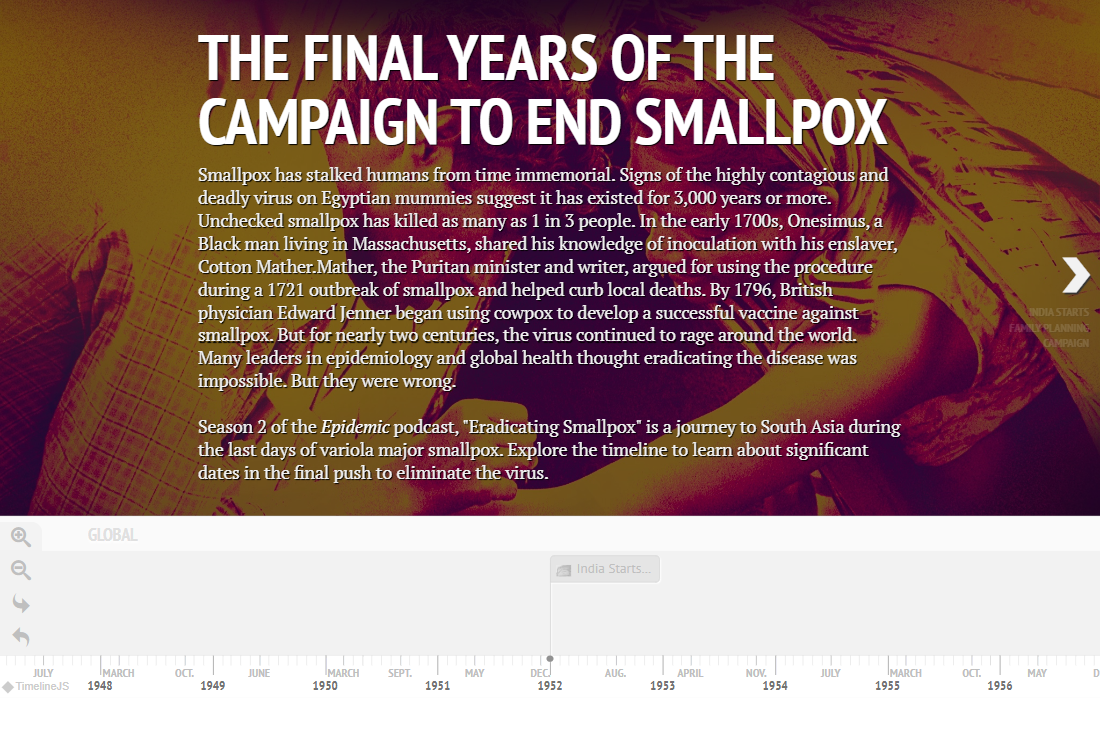 Timeline: The Final Years of the Campaign to End Smallpox https://kffhealthnews.org/news/article/podcast-epidemic-season-2-timeline/